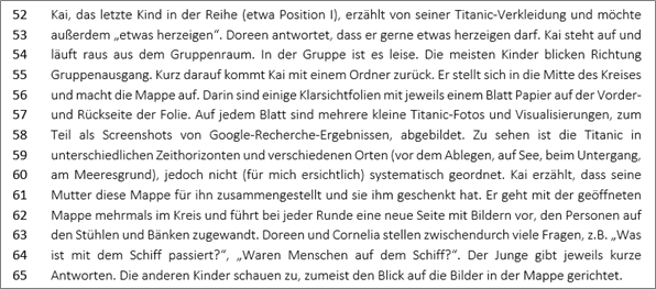 Der Mittagskreis ist ein täglich stattfindendes, räumlich (im Kreis, im Gruppenraum der ‚Stammgruppe‘ in der teiloffen geführten Einrichtung) und zeitlich (mittags, nach dem Freispiel) organisiertes pädagogisches Arrangement. Obwohl der Mittagskreis eigentlich eher auf ‚kollektivierende Praktiken‘ abzielt, bietet er hier auch die Möglichkeit, individuelle Aufmerksamkeit zu schenken. Agency kommt dabei insbesondere Kai zu. Diese wird ihm relational eröffnet, indem ihm Anerkennung entgegengebracht wird. Dies dokumentiert sich nicht nur in der verbalen Zustimmung der Fachkraft, das persönliche ‚Titanic-Interesse‘ mit der gesamten Gruppe teilen zu dürfen. Auch die anderen Kinder sprechen agency zu, was sich anhand deren Körperhaltung, der Richtung und Fokussierung der Blicke sowie der wahrgenommenen Ruhe zeigt.