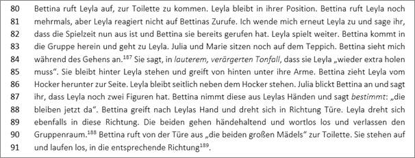 Während sich die erste Szene vor allem durch Praktiken der Anerkennung auszeichnet, in der vor allem Kai erhebliche agency zuteilwird, basiert die zweite Szene insbesondere auf Praktiken der Nicht-Anerkennung. Agency wird für Leyla hier kaum erfahrbar: Nach mehrfachen verbalen Aufrufen – erst kollektiv, dann individualisiert – kommt die Fachkraft dem Kind hier körperlich immer näher, bis sie dessen körperliche Grenzen schließlich berührt und überschreitet: Leyla wird mehrfach berührt, ihr Körper wird von der Fachkraft umpositioniert, Spielmaterial wird aus Leylas Händen genommen, ihre Hand gefasst und zur Türe bewegt.